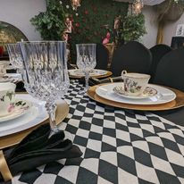 Receptions - Buffet tables with cloths, drink dispensers, decorative trays and charcuterie boards with tongs, cold and hot serving trays with serving spoons/ladles, ice bucket, cake stands and serving set, tables and cloths, cups, cloth or paper napkins, plates of different sizes, decorative charger plates and various cutlery. *no food is provided*